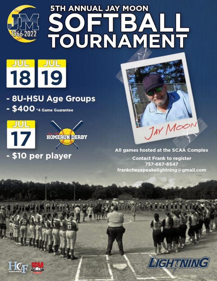 5th Annual Jay Moon Memorial Softball TournamentJuly 18-19, 2026Home Run DerbyJuly 17, 2026Contact:[email protected]